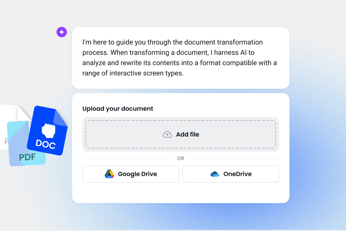 Convert documents, slides, videos, and links into complete courses with lessons and interactions