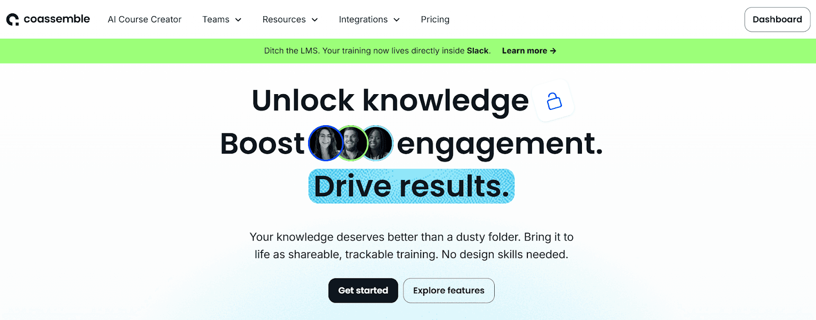 Coassemble transforms trapped knowledge in documents into interactive training. Teams upload PDFs, Word files, or PowerPoint presentations and get structured courses with AI-generated content, video integration through Loom, and AI narration. No technical expertise or design skills needed.