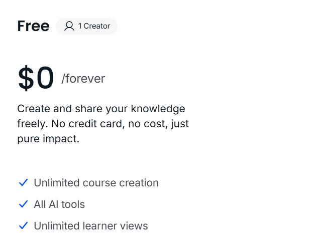Free plan available with unlimited course creation, unlimited learner views, and access to all AI tools (no credit card required)