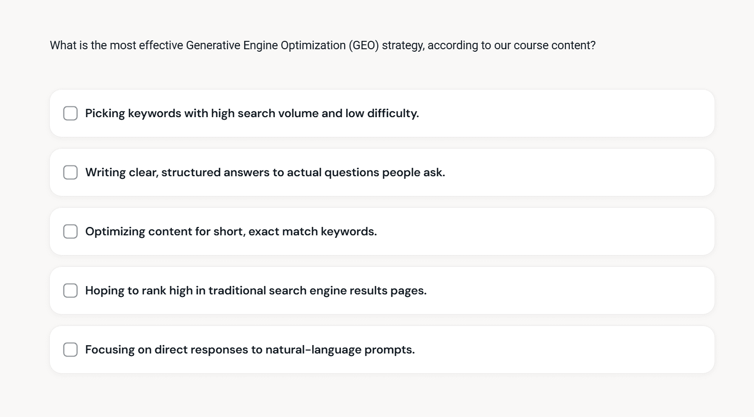 This is especially important for new topics. For example, a course on Generative Engine Optimization (GEO) can be tricky, as it’s a fairly new concept for marketers. Make sure that someone who is an expert in the topic reviews the final course before launching it.