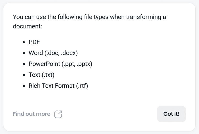 The tool breaks long documents into bite-sized lessons, adds headings, and organizes ideas into modules that make sense for your audience. You’ll often see suggested quizzes, visual layouts, and interactive elements appear automatically.