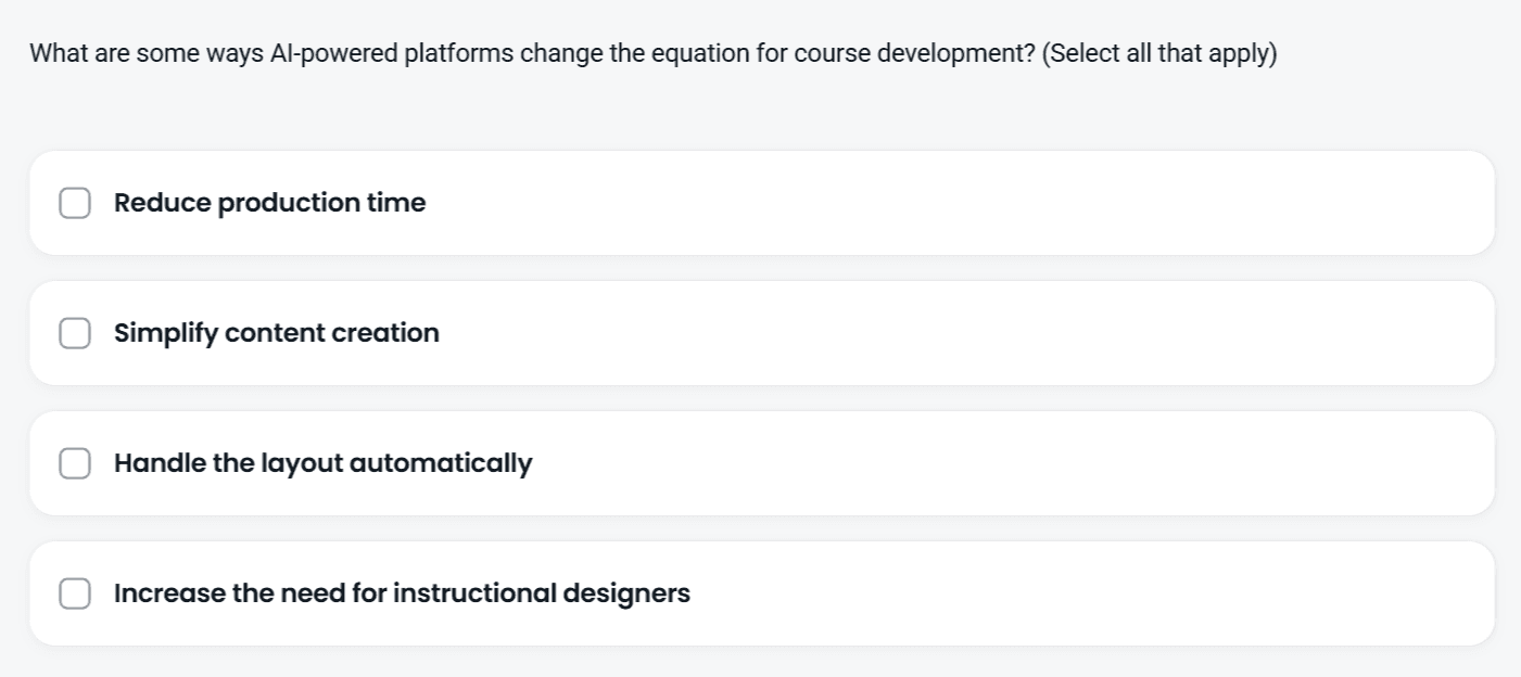 A solid AI training creator adds interaction automatically. AI generates quizzes, knowledge checks, and simple scenario-based questions the moment you upload your materials.