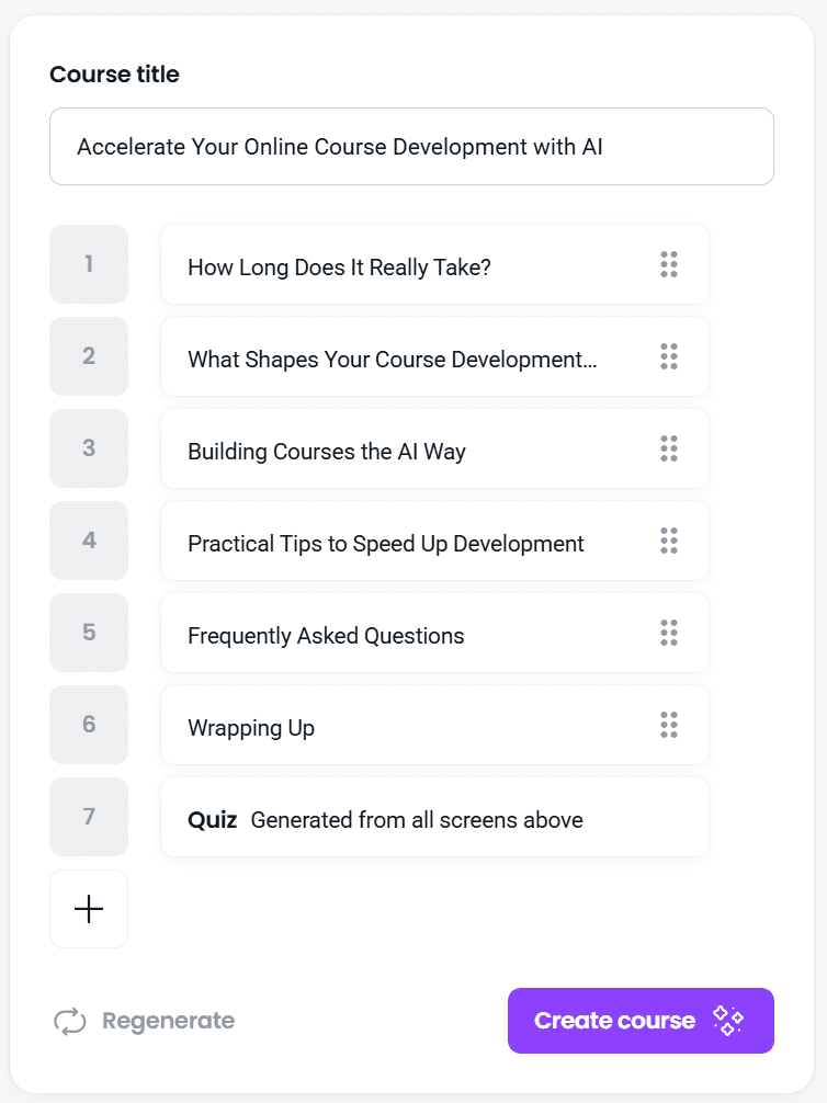 The AI training creator reads your materials, detects patterns, and generates a clear course outline in just seconds.