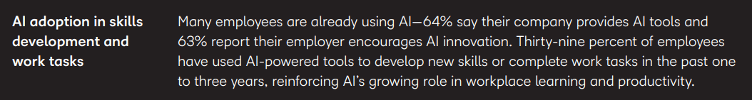 D2L’s Upskill with Purpose report shows that 39% of employees have used AI-powered tools to develop new skills or complete work tasks in the past one to three years. This learning often happens outside formal training programs.