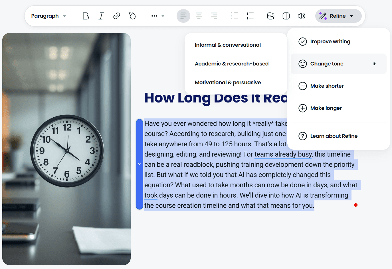 Modern tools help here. Coassemble’s AI Create can suggest interactive moments automatically, turning plain text into activities that support real skill-building.
