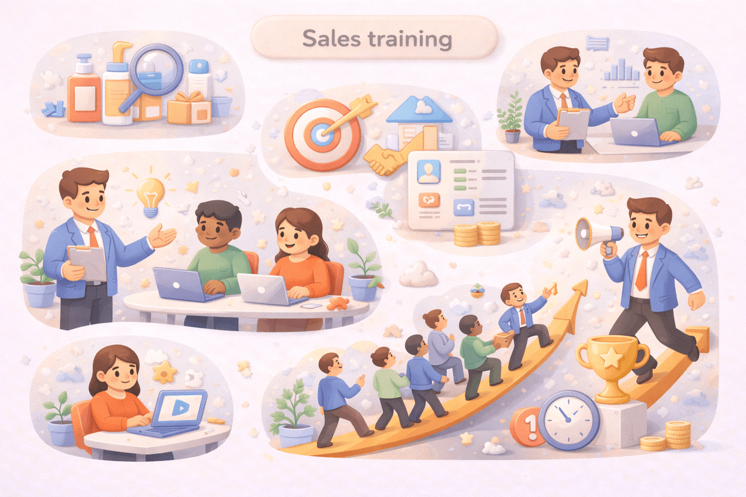 eLearning is self-paced digital training that sales reps complete on their own schedule. It includes online courses, video lessons, and interactive modules covering everything from product knowledge to sales methodology.