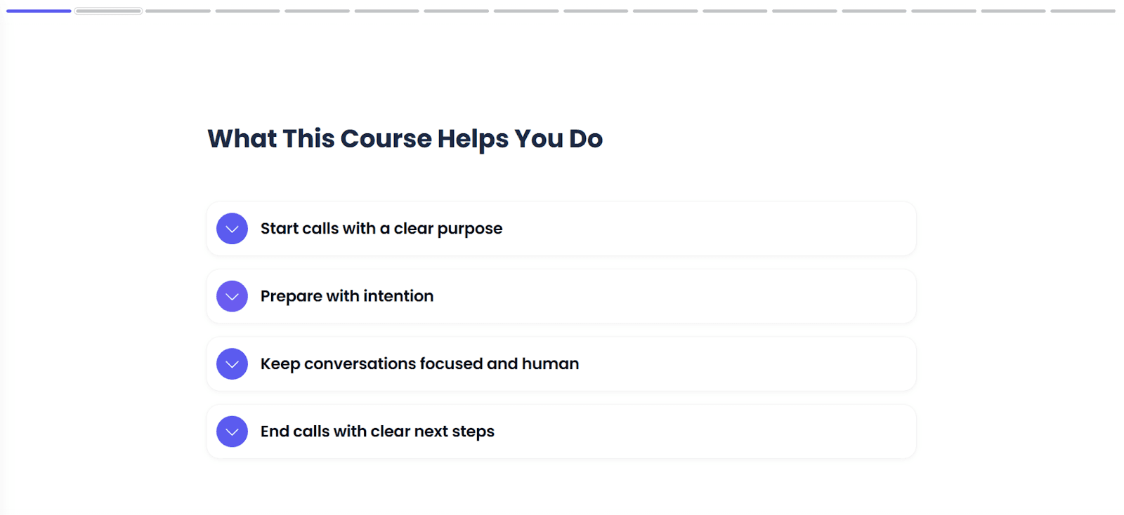 Here's a sales training course example made with Coassemble: How to Run a Successful Sales Call. You can copy and customize this template for your company in the link.