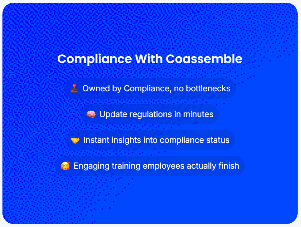 When those resources are reshaped into short, digestible courses with quick quizzes, compliance training becomes clearer and easier to follow. Coassemble lets teams update this content instantly, so it stays accurate as standards evolve.