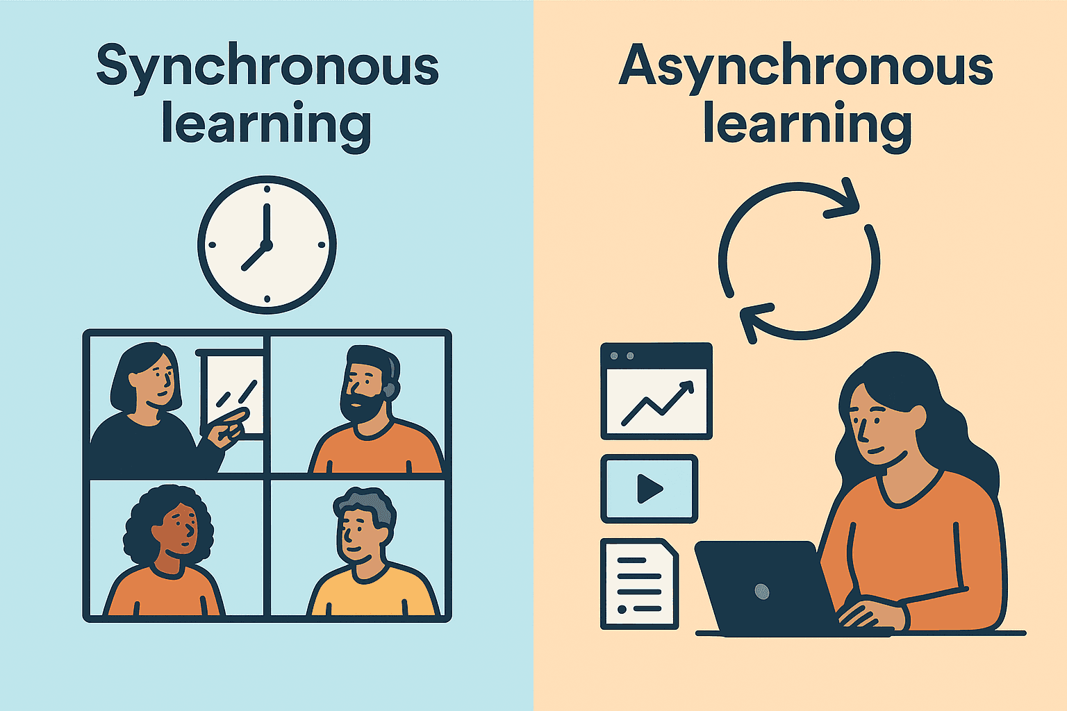 Synchronous learning happens in real time through live sessions. Asynchronous learning lets people access training on their own schedule, working through course materials, videos, or tasks without needing a shared class time.